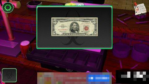 再接著回到酒吧,點(diǎn)擊吧臺(tái)的收銀機(jī),在上面輸入密碼8403,可以獲得里面的一張5美元紙幣。