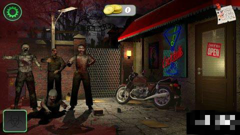 畫面繼續(xù)切換到酒吧門口,這時(shí)路燈修好了,下面的喪尸出現(xiàn)。用剛購(gòu)買的狙擊弩來(lái)消滅喪尸。