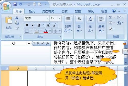 在以前的版本中,但我們向某個單元格中輸入大量的字符后,再選中該單元格,則編輯欄中顯示出的內(nèi)容,遮蓋住了下面的某些單元格中的內(nèi)容。在2007中,編輯欄具有了折疊功能。通常情況下,只顯示出1行的內(nèi)容,如果要在編輯欄中查看整個內(nèi)容,只要單擊一下右側的折疊按鈕即可(如圖2)。編輯欄全部展開后,整個表格自動下移(參見下圖),不會遮蓋掉表格中的任何內(nèi)容。