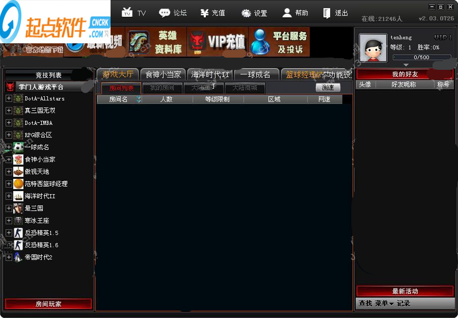 3、下圖紅框里面競(jìng)技列表,游戲的平臺(tái)包括了一球成名、真三國(guó)無雙、Dota、最三國(guó)等;