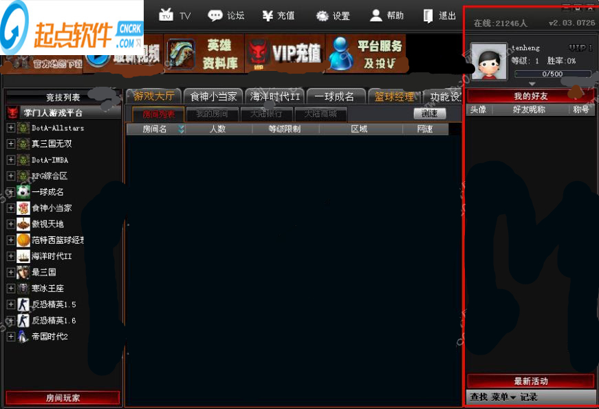 6、下圖紅框里面包括了魔獸RPG、最新的視頻、英雄資料庫(kù)、VIP充值、平臺(tái)服務(wù)及投訴等;