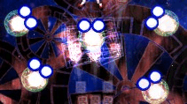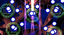 三個同色小飛碟觸發(fā)大飛碟,三個不同色觸發(fā)彩色飛碟,不滿足開碟條件則會頂?shù)糇钭筮叺囊粋€飛碟?;礻P藍碟無用,紅碟喂?jié)M獎勵0.25殘,擊破掉落0.25殘;綠色喂?jié)M1B,擊破0.33B;擊破所有飛碟以及彩碟喂?jié)M時會給一個變色飛碟,顏色和開碟時最后吃掉的相同。變色飛碟(會閃爍)按照紅-藍-綠-紅變化(大約150f一次),自機靠近小飛碟時顏色不會改變(飛碟停止閃爍)。