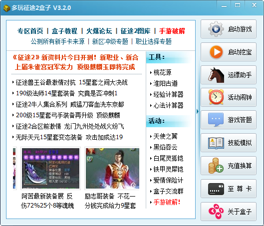 征途2盒子是多玩開發(fā)的征途2游戲輔助工具,功能不多但是很實(shí)用。征途2盒子主要功能有征途2挖寶助手,活動(dòng)鬧鐘,征途2游戲答題輔助,技能模擬,充值換算等常用功能。目前征途2盒子已經(jīng)擁有10W使用者。