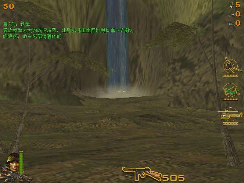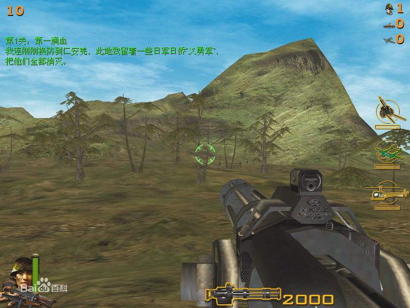 在1944年的大反攻中,你作為一名中國軍人,擔(dān)任先遣隊的一員,向緬甸一望無際的叢林中搜索前進。由于情報有誤,你不慎深入日寇的大部隊中,此時,我軍主力尚在100公里以外,敵人卻如潮水般涌上前來??偛拷o你的命令是死守陣地,直至大部隊趕到?,F(xiàn)在,你成了一名真正的英雄,一人對抗成千上萬的兇惡敵頑。但是你并不孤單,你擁有精良的武器,包括M1911式自動手槍,性能卓越的Thompson沖鋒槍,點面俱到的迫擊炮,還有坦克殺手——巴祖卡,當(dāng)日軍的坦克和裝甲車大搖大擺地開過來時,用你的巴祖卡把敵人的烏龜殼轟上天!