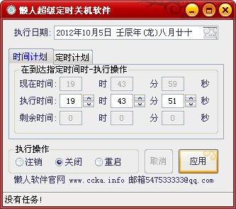 懶人超級定時關(guān)機軟件 1.03綠色版 懶人超級定時關(guān)機軟件是一款方便用戶定時關(guān)機的輔助工具。該定時關(guān)機綠色版操作簡單方便,打開即可使用,支持定時重啟,關(guān)機,注銷功能。