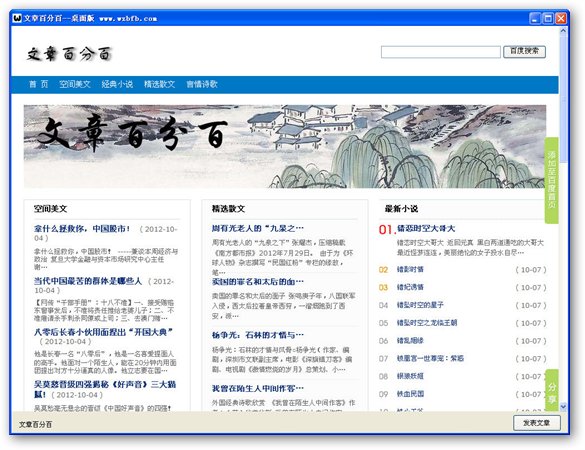 文章百分百是一個以美文為主題的綜合文學(xué)網(wǎng)站.內(nèi)含有各種優(yōu)美哲理文章,優(yōu)美傷感文章,現(xiàn)代詩歌散文,優(yōu)美抒情散文,小說.讀文章,就用文章百分百桌面版!