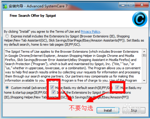 然后我們進入“Free Search Offer by Spigot”,這里我們選擇“Custom install”,但是后面的選項都不要勾選,然后點擊“install”