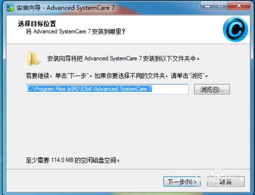 接下來,我們選擇安裝位置,點擊瀏覽選擇你想要將Advanced systemcare 7安裝在哪里,然后確認,下一步。