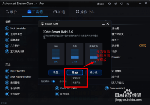然后,我們點擊開始,我們會發(fā)現(xiàn),有兩個選項,分別是智能釋放與深度釋放。要是你想要大體的清理一下電腦,就直接點擊“智能釋放”,如果你想要全面的釋放內(nèi)存,你就點擊“深度釋放”。