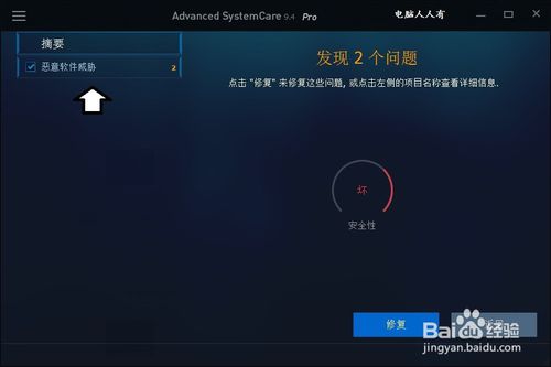 100%之后發(fā)現(xiàn)兩個危險程序→點擊左邊的項目名稱,查看究竟。