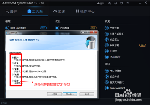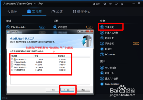 文件恢復(fù)是恢復(fù)回收站里面被刪除的文件,如果你刪除了你認為還有用的文件,無論是圖片,還是文檔亦或是文件夾都可以通過文件恢復(fù)來恢復(fù)。我們要做的就是打開文件恢復(fù),然后選擇你要恢復(fù)文件的位置,然后點擊下一步。