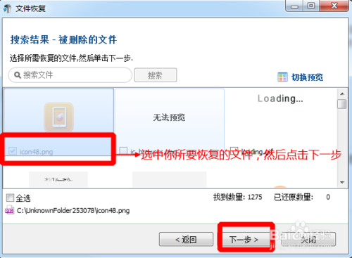 我們查看一下,掃描的結(jié)果里面是否有我們需要的恢復(fù)的文件,然后選中,點擊下一步。