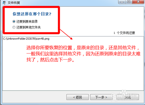 選擇你想要把文件恢復(fù)的位置,是原來的目錄,還是其他文件夾,一般我們這里選擇其他文件夾,因為原來的文件夾太難找了。選擇好以后,點擊下一步。