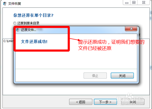 下一步之后,軟件會給出提示,說文件還原成功。這樣就證明我們想要的文件已經(jīng)被還原。我們可以在我們指定的位置查看我們的文件。