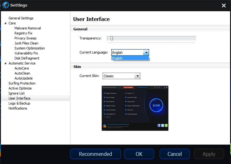 打開Advanced SystemCare – >點擊選項圖標(biāo)左上角- >選擇設(shè)置 – >點擊用戶界面左側(cè)面板- >選擇您想要的右側(cè)面板上的語言- >點擊Apply(應(yīng)用)和OK(確定)。