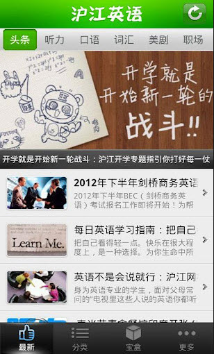輕松一點(diǎn),雙語、聽力、口語、詞匯…英語學(xué)習(xí)盡在掌握。界面清新簡潔,內(nèi)容豐富及時(shí),擁有文字、圖片、音視頻的多媒體閱讀體驗(yàn),邊看邊聽邊讀,全面提升你的聽說讀能力。支持離線下載,無網(wǎng)絡(luò)也能輕松閱讀學(xué)習(xí)!滬江英語依托于資源龐大、人氣旺盛的滬江英語網(wǎng)站,為你24小時(shí)不間斷提供最新英語資訊和學(xué)習(xí)資料。安裝滬江英語,讓英語真正伴你左右吧!