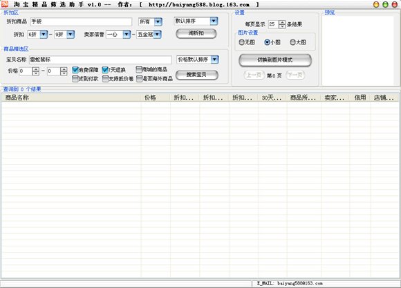 淘寶精品篩選助手是專業(yè)的淘寶網(wǎng)導購軟件,淘寶精品篩選助手可以按淘寶多種商品分類,可以按30天內(nèi)售出數(shù)量,賣家信用,地區(qū)等條件劃分寶貝,快速準確的定位淘寶成交量最大,好評最多的寶貝,淘寶精品篩選助手致力于成為廣大網(wǎng)友網(wǎng)上購物好幫手。