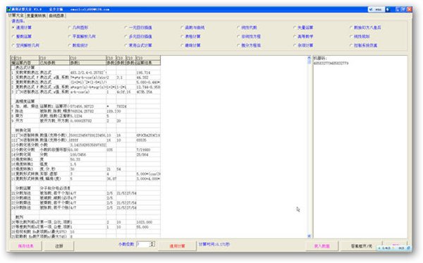 通用計算器有“通用計算”、“整數運算”、“幾何圖形”、“數組統(tǒng)計”、“函數與曲線”、“回歸插值”、“表格計算”、“趣味計算”、“線性代數”、“微分方程組”、“常用公式計算”等二十一大類功能,可實現幾百種運算,幾乎涵蓋了所有常用計算,可以說是當前網上功能最多的計算軟件。且使用方便,只要修改例程的已知數據和表達式就能計算,還可自行擴展功能。較一般計算軟件有以下一些特色: