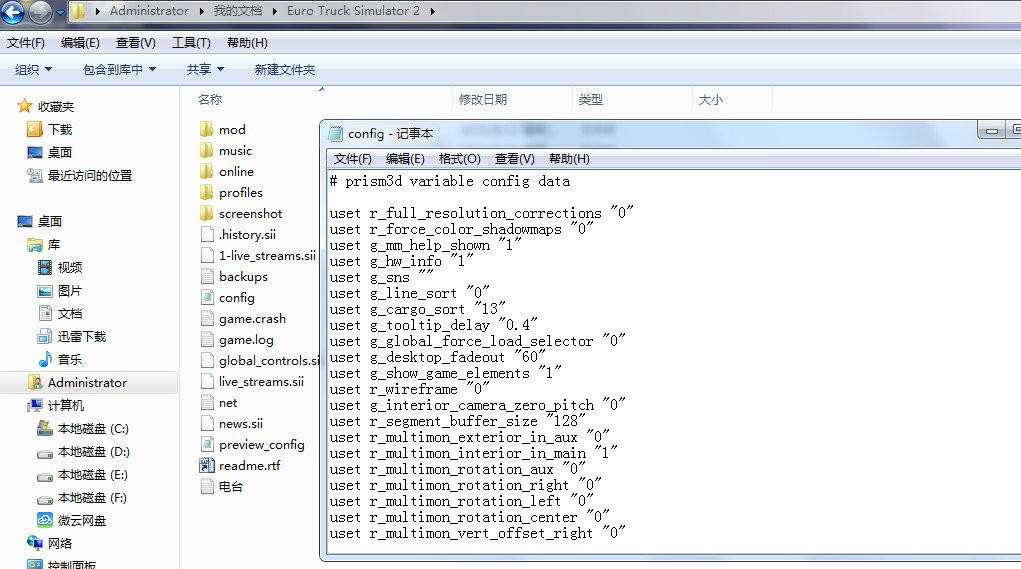 用記事本方式打開X:\Documents(我的文檔)\Euro Truck Simulator 2\ 下面的 config.cfg 文件