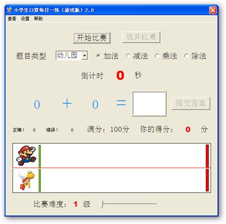 小學(xué)生口算每日一練游戲版 2.0 免費(fèi)版 小學(xué)生口算每日一練游戲版可以用于3-10歲小朋友口算訓(xùn)練使用。小學(xué)生口算每日一練游戲版的功能包括:加法訓(xùn)練、減法訓(xùn)練、乘法訓(xùn)練、除法訓(xùn)練。軟件可以設(shè)置題目難度、題目數(shù)量、答題時(shí)間等信息。
