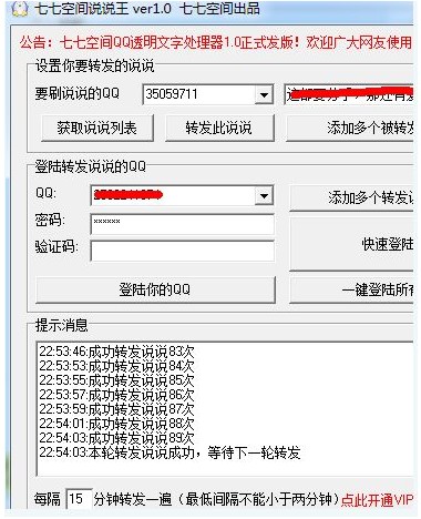 七七說說王是目前最好用的QQ空間說說轉(zhuǎn)發(fā)軟件 刷空間說說轉(zhuǎn)發(fā)軟件 可用多個小號對多個大號轉(zhuǎn)發(fā)說說的說說轉(zhuǎn)發(fā)工具。