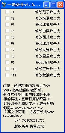 使用方法:打開修改器,點擊相應(yīng)的熱鍵就可啟用,因為本人技術(shù)原因,可能有時候會出現(xiàn):與XXX不廉容的情況,此修改器為原版專用,進程名必須是plantsvszombies.exe,英文原版也可以通用,直接把PopCapgames1.exe改成plantsvszombies.exe就可以了。