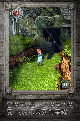 而游戲的場景3D制作得相當(dāng)不錯(cuò),主菜單里那只躲黑黑的洞里的熊看起來危險(xiǎn)感十足??上У氖亲鳛閯?dòng)態(tài)效果最多的女主角Merida的3D效果表現(xiàn)卻顯得有些不夠好。至于那只出場和上鏡的機(jī)會實(shí)在不多的熊,制作的效果還會再差一些,不過也不會有太多的人會在意這只熊的(誰讓你老是追著Merida的,活該了)。另外游戲在對于跑動(dòng)的速度感表現(xiàn)上有著很不錯(cuò)的水準(zhǔn),玩家會在游戲的過程之中逐步體驗(yàn)到越來越快的節(jié)奏和跑動(dòng),無止境的狂奔、跳躍、滑行和轉(zhuǎn)彎,將會讓你無暇顧及其他事情。