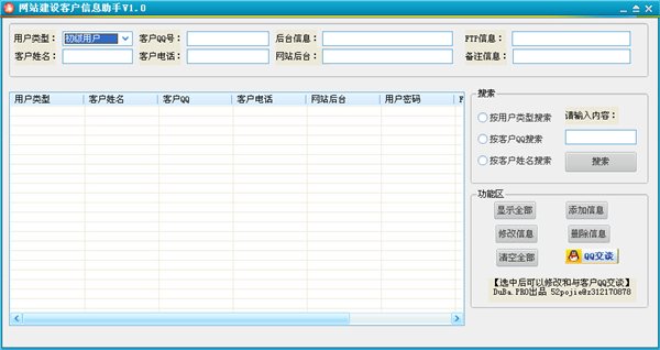 網站建設客戶信息助手是一款可以幫助用戶更好更方便的維護網站客戶信息的軟件,該軟件可以為網站客戶建立詳細的信息,方便自己了解和查看客戶。軟件的可以對信息進行顯示、添加、修改、刪除、清空等操作。