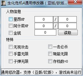 下半部分是「特殊」部分,可以實現(xiàn)一些特殊功能。勾選前邊的方框,即可實現(xiàn)「無視攻擊」、「一擊必殺」、「手雷無限」、「弩箭無限」、「子彈無限」和「存檔數(shù)=0」等功能。