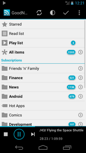 真正是一個新聞閱讀器(RSS/ATOM)和音頻播客播放器與著名的谷歌閱讀器完全同步。古德紐斯擁有現(xiàn)代化的用戶界面,它提供了大量的專業(yè)和獨特的新聞閱讀器的功能,包括離線支持(包括圖像),自動推送的局部變化,閱讀的文章列表,訂閱分組列表,標識出上滾動,自動關(guān)閉視圖,音量鍵導航,多了不少。超過50個選項,可讓您完全按照您的需求定制好的消息。