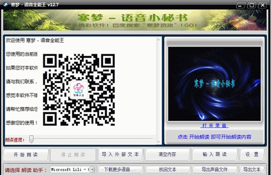寒夢語音小秘書 V12.7 綠色版 寒夢語音小秘書是一款可以將文字讀出來的軟件!一款可以將txt電子書、wod文檔、wps文檔、log記錄文本、dic字典文本、bat批量處理、ini配置文本、inf安裝信息、css層疊樣式表、等文本文件等文字轉換成mp3語音的軟件文出有聲之語音小秘書