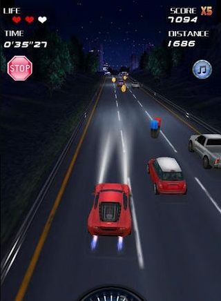 《午夜狂飆SpeedNight》3D瘋狂賽車,這是一款以午夜賽車為主題的3D游戲。左右搖擺設(shè)備,控制你的賽車的轉(zhuǎn)向,躲過(guò)路上的NPC車輛。在行始過(guò)程中,你可以收集金幣,這可以讓你在選車界面