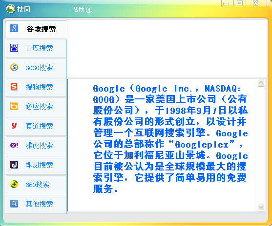 搜同是一款主流搜索引擎大全合集,集合了包括google,百度,搜搜,搜狗,必應(yīng),有道,雅虎,即刻,360和其他搜索引擎。都是網(wǎng)民常用的。非常的方便自由切換。