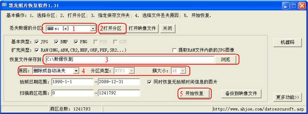 1. 選擇分區(qū)。選擇需要恢復(fù)數(shù)據(jù)的盤(即源盤) 必須在上圖標(biāo)記為1的下拉列表中有對應(yīng)的盤符 才能進(jìn)行恢復(fù)。對于數(shù)碼相機(jī)、存儲卡和U盤之類的即插即用設(shè)備 需要先將設(shè)備連接到電腦USB口 后打開軟件 才能選擇相應(yīng)的盤符。有的相機(jī)用USB連接線連到電腦USB口在電腦上并不出現(xiàn)盤符 就需要把存儲卡取出 用讀卡器連接電腦進(jìn)行恢復(fù)。本軟件可支持從軟盤、硬盤、光盤、USB閃存盤、各種存儲卡、相機(jī)等恢復(fù)照片文件。
