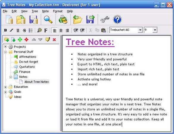 Tree Notes 3.014 英文版 Tree Notes是一款功能強(qiáng)大,使用方便的通用記事管理程序。它按照樹狀排列用戶的備忘錄和記事本。用戶可以把這款軟件作為計(jì)劃工具,或者項(xiàng)目管理工具,個(gè)人信息管理工具,電子日記或者其它什么文本類的工具.