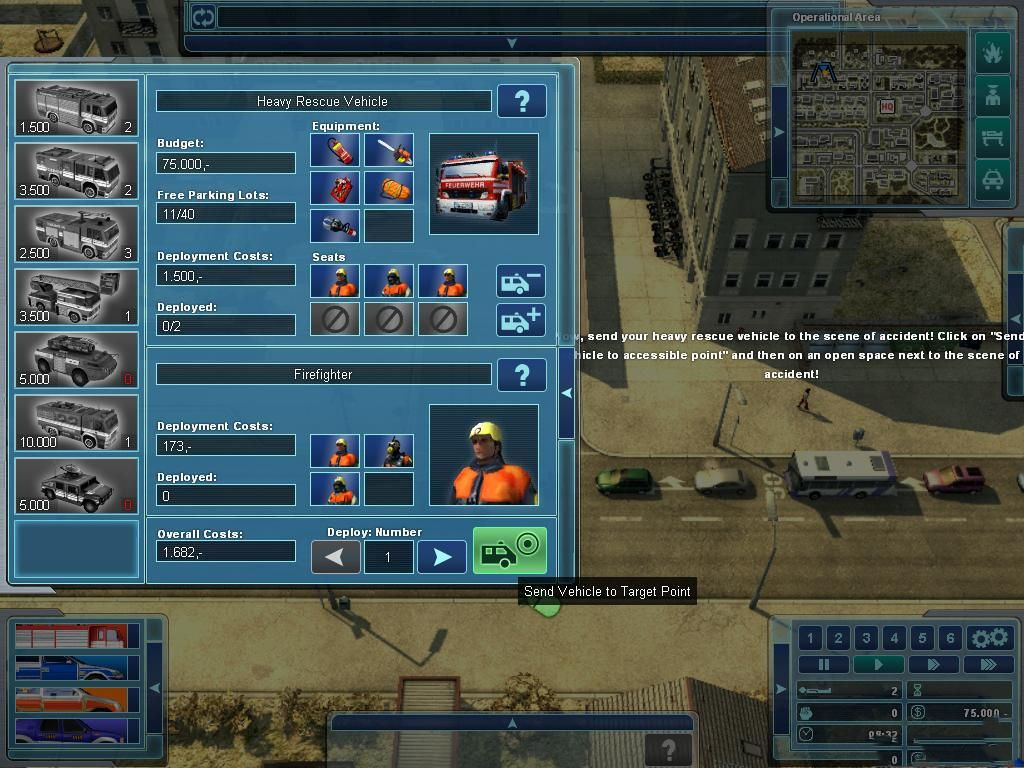 至于自由模式和多人模式,那就是用政府所擁有的財(cái)政資金(budget)來(lái)購(gòu)買(mǎi)所需車(chē)輛和人員,從HQ派遣到現(xiàn)場(chǎng)去,自由模式有無(wú)限循環(huán)(Endless Game,難度一致不變,教學(xué)打開(kāi)還是不打開(kāi),四種天氣的地圖,炎熱(Heat),雪地(Snow),暴風(fēng)(Storm),天氣大雜燴(Deluxe)。