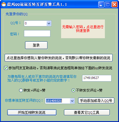 晨風QQ說說互轉互評互贊工具 v1.44 綠色免費版 晨風QQ說說互轉互評互贊工具 v1.44 綠色免費版