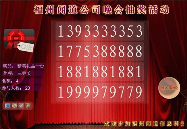 聞道全能抽獎(jiǎng)軟件是一款用照片、號(hào)碼、姓名抽獎(jiǎng)的軟件。軟件擁有全面的功能和專業(yè)的界面顯示效果,滿足單位晚會(huì)、年會(huì)、商場(chǎng)、超市以及網(wǎng)吧等商業(yè)抽獎(jiǎng)需要。