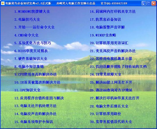 電腦菜鳥必備知識寶典 V2.0正式版 電腦菜鳥必備知識寶典,v2.0版本收選三十篇最常用的電腦基礎(chǔ)知識,包含電腦快捷鍵大全、運行命令大全、WINDOWS使用技巧大全、系統(tǒng)優(yōu)化方法、硬件基礎(chǔ)知識、bios詳解、IPS$知識大全、防黑客必備知識等等。另外軟件還有7個隱藏的金蛋,包括詩詞、對聯(lián)以及娛樂模塊。