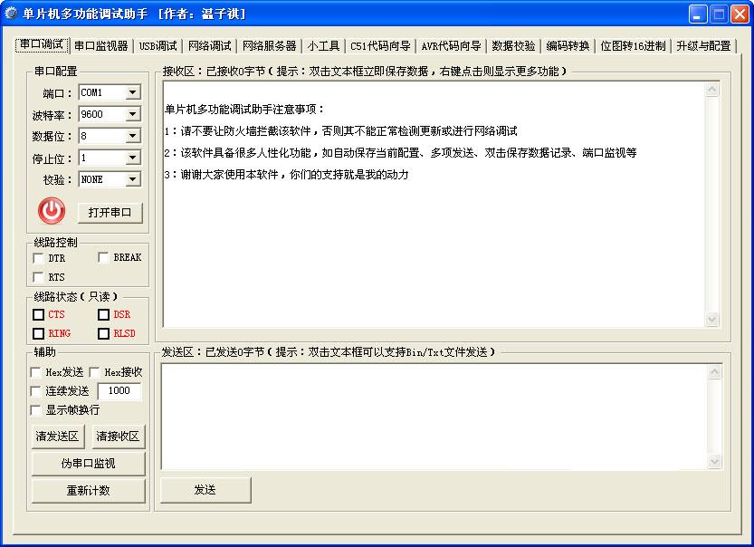 單片機(jī)多功能調(diào)試助手一款集串口/USB/網(wǎng)絡(luò)調(diào)試、進(jìn)制轉(zhuǎn)換、字模與數(shù)碼管字型碼制作、常用校驗(yàn)值計(jì)算、UNICODE碼轉(zhuǎn)換、位圖輸出C文件等眾多功能于一身的綜合型調(diào)試軟件。