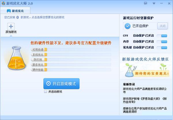 游戲優(yōu)化大師是盛大為游戲玩家開發(fā)的游戲加速軟件,能最大限度的優(yōu)化本機電腦,為玩家們在游戲中每一分每一秒的賞心悅目保駕護航。游戲優(yōu)化大師為流暢游戲體驗而生的通用優(yōu)化工具,幫您解決游戲時的卡機、停頓、彈窗干擾等問題,只需按下“開啟游戲模式”即可一鍵優(yōu)化。