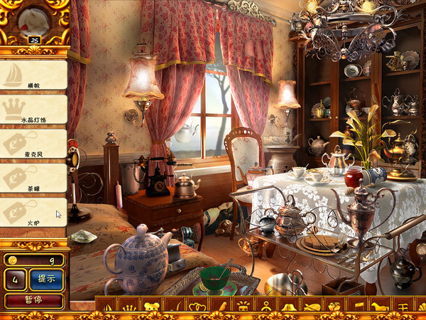 規(guī)則和同類作品類似,上手十分簡單便捷。左側(cè)的詞條提示畫面中隱藏的物體,你只要按照提示來尋找即可。不僅要找到限定的單詞,每個場景中還要隱藏的金幣。游戲中包括多種不同形式的提示道具。