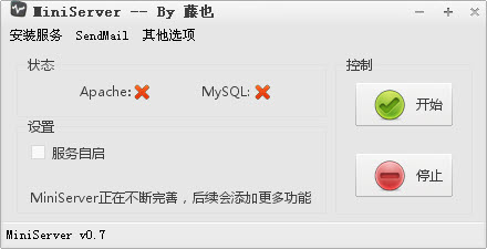 6.改進(jìn):減少部分彈出提示,信息欄增加設(shè)置隨機(jī)啟動(dòng)和開(kāi)關(guān)Memcached時(shí)的提示,安裝及卸載MiniServer時(shí)增加進(jìn)度條顯示,切換模式時(shí)會(huì)智能判斷并提示關(guān)閉當(dāng)前服務(wù)