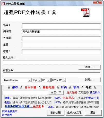 一款高質(zhì)量的PDF文檔轉(zhuǎn)換工具。完全兼容PDF規(guī)格,超強(qiáng)轉(zhuǎn)換功能??勺杂傻貙⒏鞣N文本文件迅速地轉(zhuǎn)換成為PDF文件。您不妨下載試試^_^