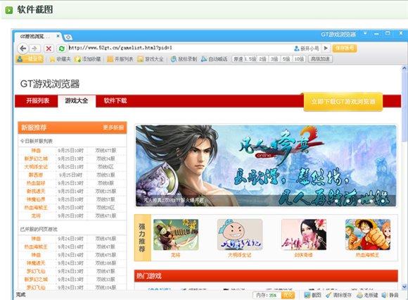 GT游戲瀏覽器是一款專門針對網(wǎng)頁游戲玩家打造的專用瀏覽器。提供一鍵登錄,鼠標(biāo)錄制,自動喊話,游戲加速等網(wǎng)頁游戲?qū)俟δ?。并且提供《龍將》、《神曲》、《神仙道》等熱門游戲的每日最新開服信息,讓你酣暢淋漓的享受網(wǎng)頁游戲的樂趣。