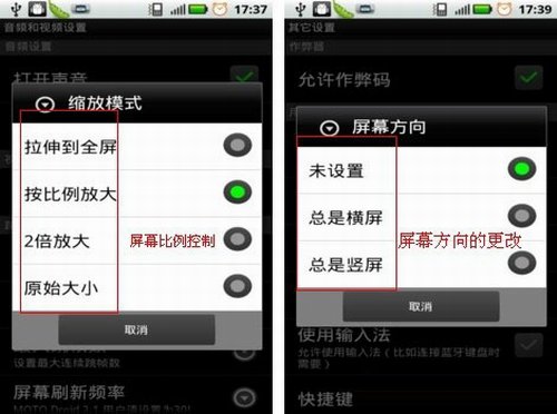 2、是不是會(huì)覺(jué)得有些奇怪,為什么上面截圖這個(gè)屏幕是豎著的。而且還這么小。當(dāng)然屏幕是可以根據(jù)你的喜好來(lái)自由調(diào)整的。在菜單鍵里選擇設(shè)置→音頻和視頻設(shè)置→縮放模式就可以來(lái)自由調(diào)整畫(huà)面的比例了。然后要改變屏幕方向的話也是類似的操作就可以完成。設(shè)置→其他設(shè)置→屏幕方向,按照操作即可。