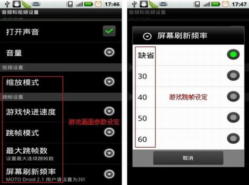 3、GameBoid模擬器功能很強(qiáng)大。除了屏幕可以調(diào)轉(zhuǎn)之外GameBoid還可以對(duì)屏幕的跳幀和刷新率進(jìn)行調(diào)整。(這個(gè)功能同樣是在設(shè)置→音頻和視頻設(shè)置功能里實(shí)現(xiàn)的)不過(guò)需要提醒一下各位同學(xué)。如果你的安卓手機(jī)系統(tǒng)是2.1的話一定要記得將刷新頻率設(shè)定在30。不然也許會(huì)出現(xiàn)一些顯示上的問(wèn)題。這個(gè)功能比較適合一些具有一定基礎(chǔ)的用戶使用,普通用戶默認(rèn)即可。
