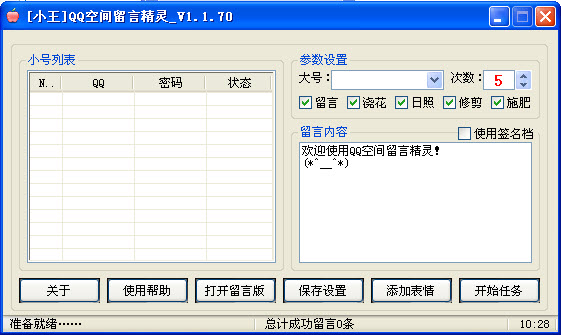 小王QQ空間留言精靈是一款可以幫助用戶自動在QQ空間留言軟件,該軟件支持批量登陸小號刷留言,還可以刷花藤屬性,是用戶刷QQ空間留言的好助手。