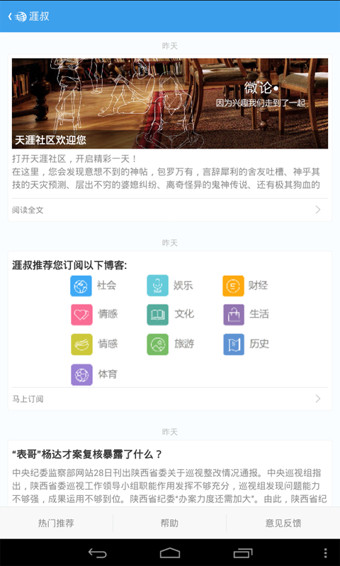 天涯社區(qū)不同于與掌中天涯純論壇的閱讀模式,全面支持論壇、微博、博客、來吧的功能體驗,是一款‘論壇+微博’,能挖爆料、看美圖、讀小說、聊經(jīng)歷、曬心情、交朋友的主流手機應用。