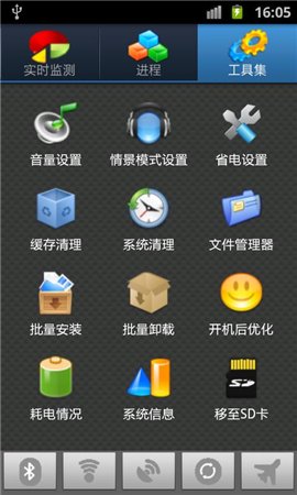 1 監(jiān)控狀態(tài)(cpu, 內(nèi)存, 電池)2 進(jìn)程管理(可以區(qū)分出不同類別的進(jìn)程, 避免誤殺、快速優(yōu)化和自動(dòng)優(yōu)化可以智能的關(guān)閉無(wú)用進(jìn)程、忽略列表可以進(jìn)行個(gè)性化設(shè)置)